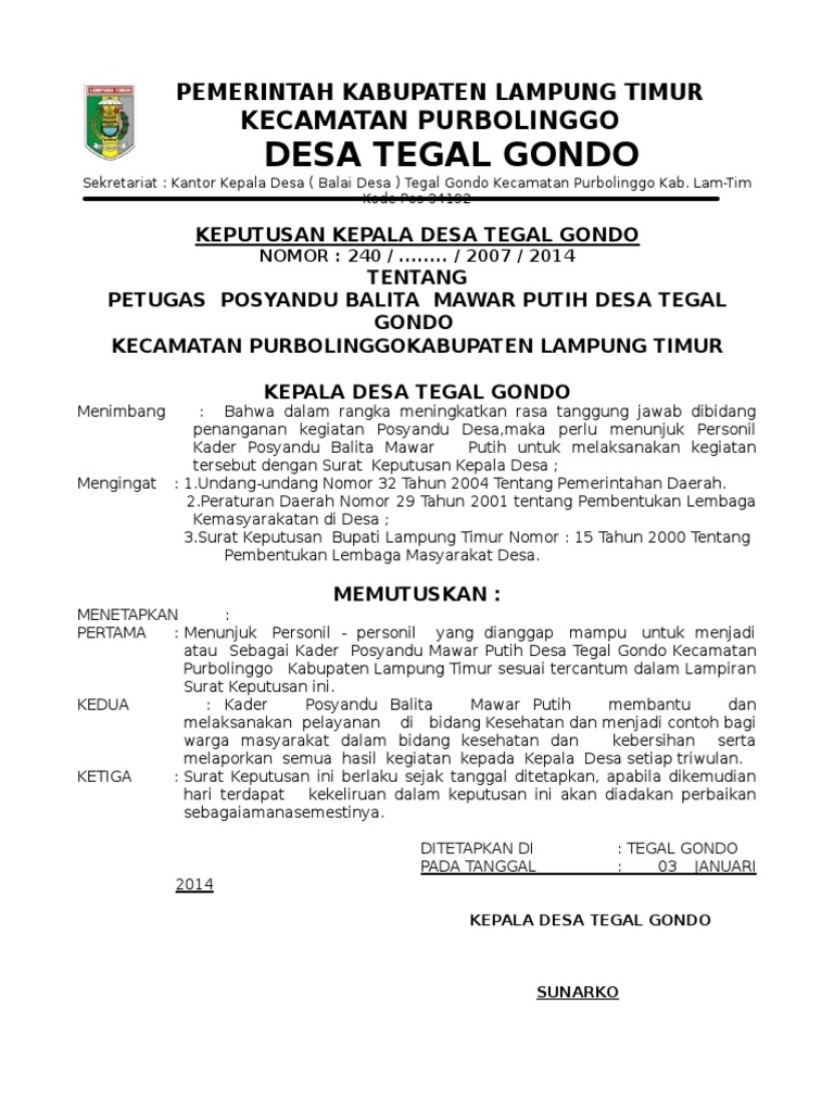 Contoh sk pengangkatan rt imam desa dan tokoh adat format 425 x 703 contoh sk pengangkatan pendidik dan tenaga kependidikan revisi format 638 x 976 pixel download contoh sk pengangkatan operator sekolah terbaru format format 450 x 640 pixel. Tersusunya suatu pola dan cara pemecahan permasalahan yang dihadapi para lanjut usia. This document was uploaded by user and they confirmed that they have the permission to share it. Kumpulan soal cerdas cermat kader posyandu contoh soal cerdas cermat kader posyandu pdf. Contoh sk kepala desa untuk pengangkatan kader posyandu download contoh sk kepala desa untuk pengangkatan kader posyandu download format surat lain: Contoh sk kader posyandu balita dan ibu hamil terbaru, format ms word. Sop pembinaan kader posyandu august 2020 0. Tujuan umum setelah selesai mengikuti pelatihan kader posyandu, diharapkan para kader posyandu dapat mengelola dan melaksanakan kegiatan minimal di posyandu (5 program posyandu) 3. Bahwa berdasarkan pertimbangan sebagaimana dimaksud huruf a tersebut, dipandang perlu menetapkan keputusan kepala desa tentang pengangkatan kader posyandu desa batuatas barat kecamatan batuatas tahun anggaran 2020. Tags peraturan poskesdes posyandu sk. Terselenggaranya posyandu melibatkan banyak pihak di antaranya kader, petugas kesehatan dan lurah. Penunjukan kader pos pembinaan terpadu (posbindu) sk kades 2020: Keputusan kepala desa cilayung nomor.